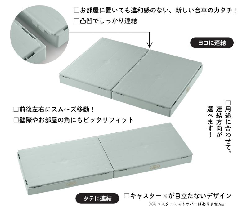 タテやヨコにも連結可能!台車っぽくない“ ハッピーカラー”は、お部屋のインテリアに違和感なくマッチします。
