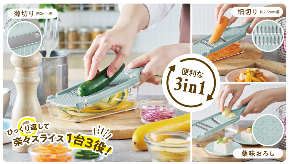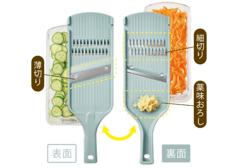 表面で薄切り、裏面で細切り&薬味おろしができる1台3役のハンディスライサー!