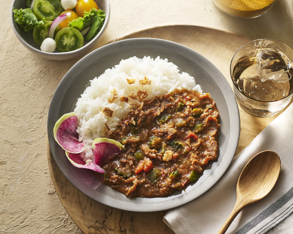 水、ミニトマト、玉ねぎ、豚肉、ピーマン、ゴーヤ、おろしにんにく、おろししょうが、しょうゆ、カレールーの順にポットに入れ、ふたをする。