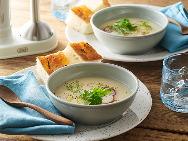 鍋にバターを入れて弱火で熱し、長ねぎを加えて炒める。長ねぎがしんなりしたら、かぶ、出汁を加えて中火にする。沸騰したら火を弱め、10分ほど煮る(かぶに火が通るまで)。塩で味を調えてよく冷ます。